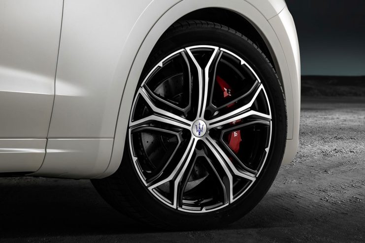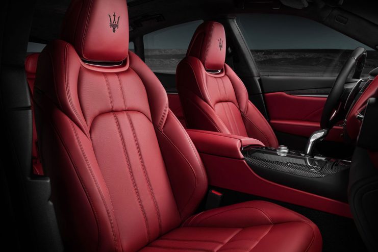 The exterior of the vehicle boasts the elegant and sport-oriented aesthetics of the Trofeo, but with a lower front fascia and rear bumper, along with adaptive LED Matrix headlamps, chrome-framed front grille, and 20-inch dark gray staggered Efesto alloy wheels with 21 and 22-inch options available. The interior features perforated leather seats with Pieno Fiore leather option available, new gearshift lever with shorter travel and improved functionality, heated leather sport steering wheel, aluminum column-mounted paddle shifters and Inox sport pedals, and a 14-speaker Harman Kardon audio system.