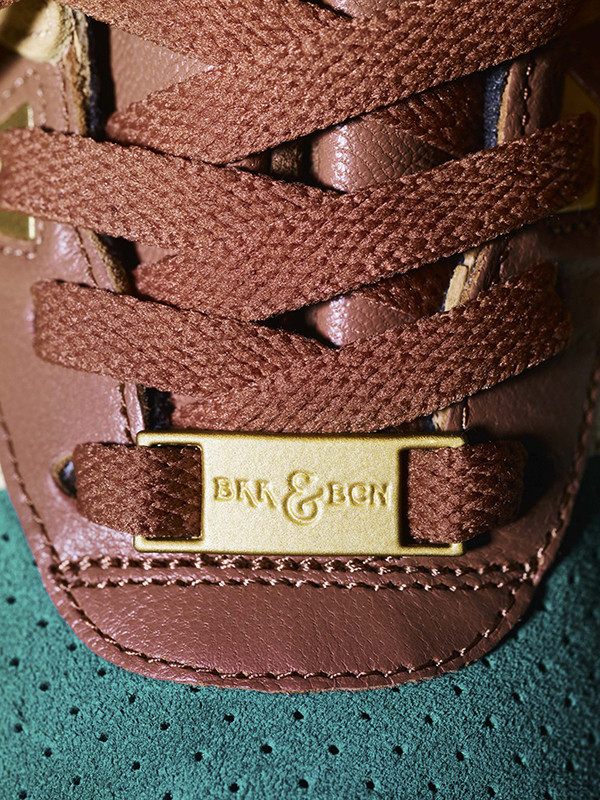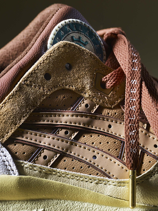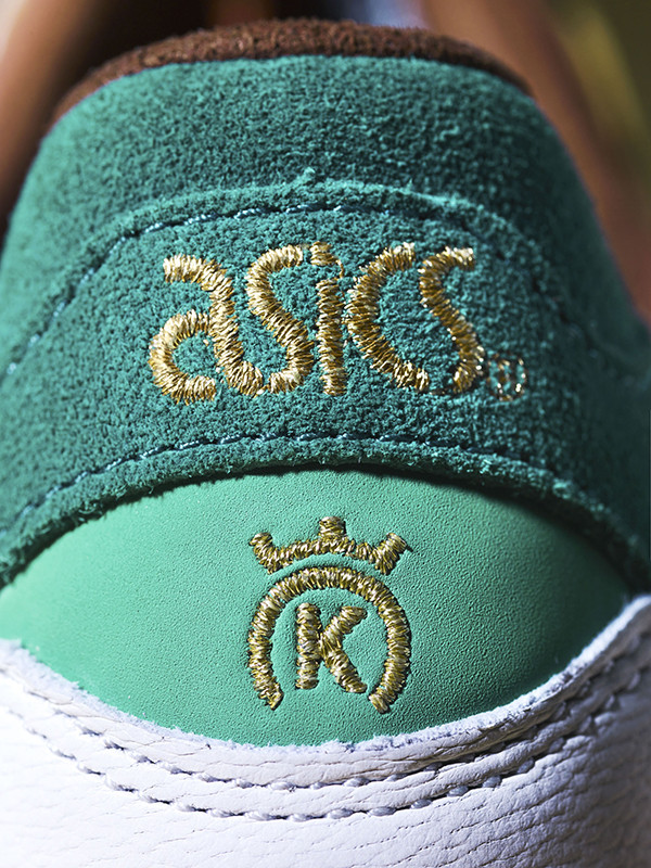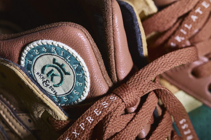 The sneaker sports a selection of textures, with premium suede, leather and nubuck utilized. The colorway includes green vamp and heel, with yellow and tonal light brown accents appearing across the upper. Rounding out the collaborative project, is a woven co-branded badge on the half tongue complete with green embroidered details, as well as gold embroidered co-branding on the heel counter.