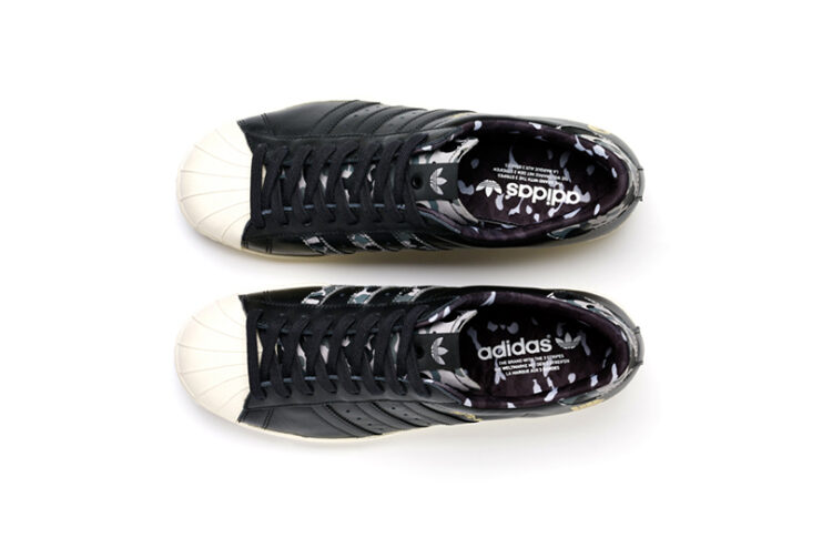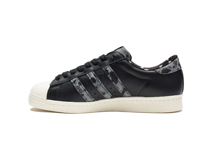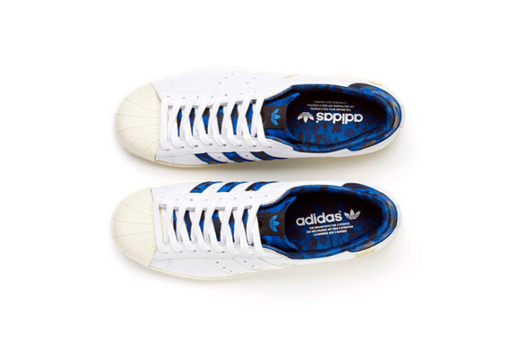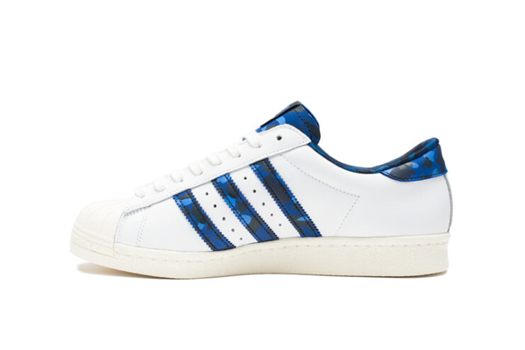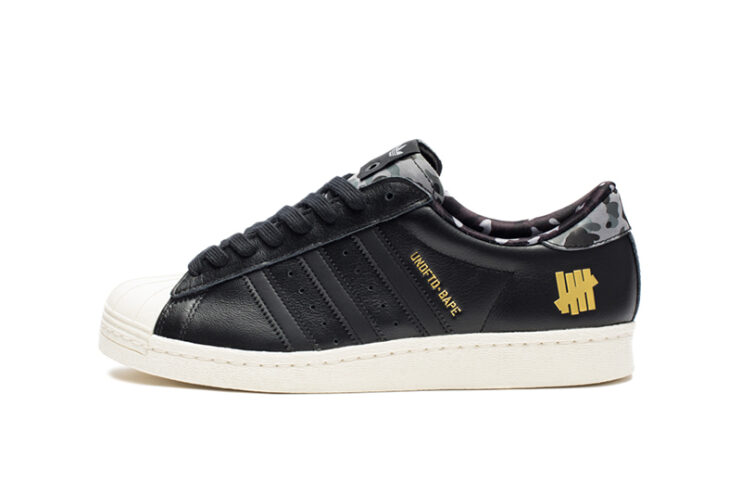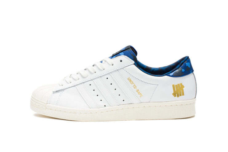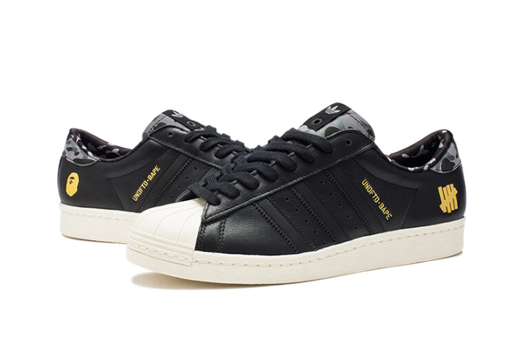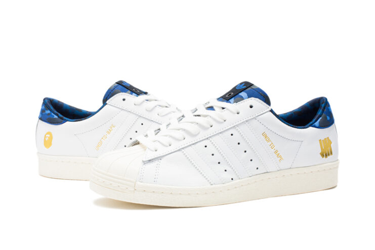 A Bathing Ape, adidas and UNDFTD (Undefeated) join forces for their second collaboration. Featuring the adidas Superstar 80s model, including subtle details of the signature BAPE print on the heel tab, inner sole, tongue and three inner stripes. The premium leather trainer is available in white with blue accents and black with grey accents. Releasing globally on the 18th of April, the collection will be available to purchase in the UK at Dover Street Market, Foot Patrol, END and Hannon.