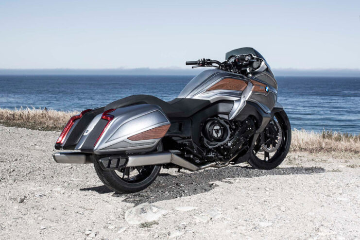 Recently at Concorso d’Eleganza Villa d’Este at Lake Como, BMW revealed its newest motorcycle concept with the BMW Motorrad “Concept 101,” which the Head of BMW Motorrad Design Edgar Heinrich describes as the epitome of elegance, power and luxury on two wheels. The drop-shaped bagger model is an exclusive custom bike that features incredible torque with its 1,649cc (101 cubic inch) six-cylinder engine. The streamlined and elongated body is boasts carbon fiber materials, a dark wood trim, brushed aluminum accents, black leather seats, LED taillights, two side cases with matching wood trim, and a sporty dual exhaust system.