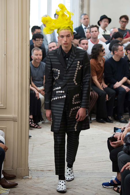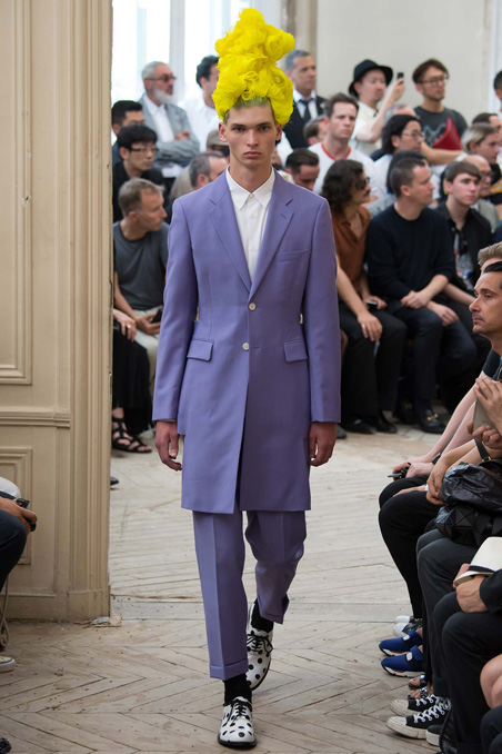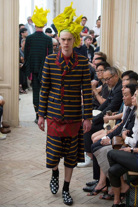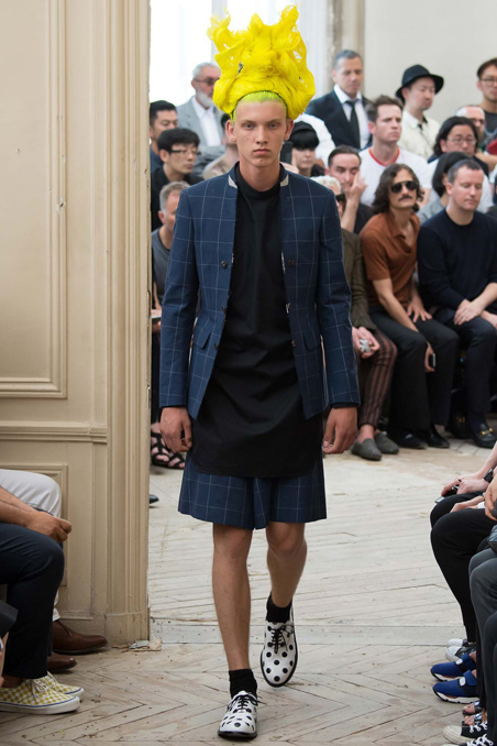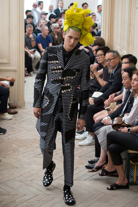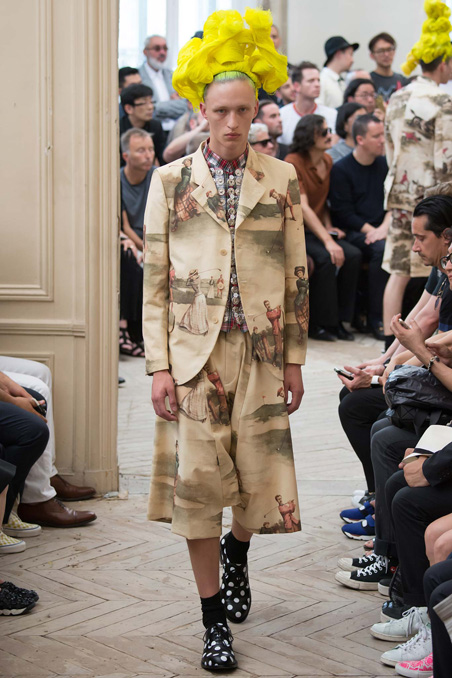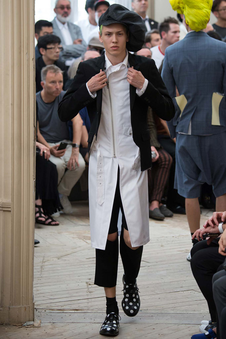 For COMME des GARÇONS Homme Plus’ spring 2016 collection, Rei Kawakubo has drawn inspiration from scenes from a traditional British hunting, golfing, and fly-fishing in the pastime. Featuring a color palette of predominantly beige, green, brown and black, on a number of pieces, the main highlight was the special metal embellishment, hand-sewn onto select pieces. The entire outfits are paired with black and white polka dots shoes, which screams COMME des GARÇONS all-through. View the collection in its entirety in the above gallery, and proceed to their website to peruse their current stock.