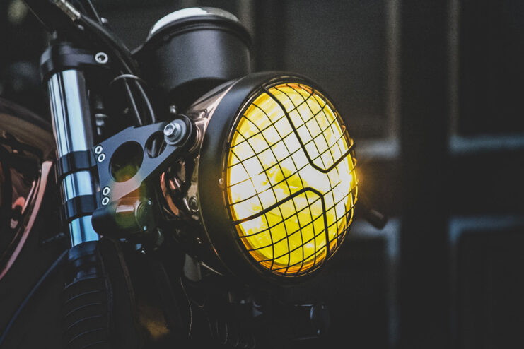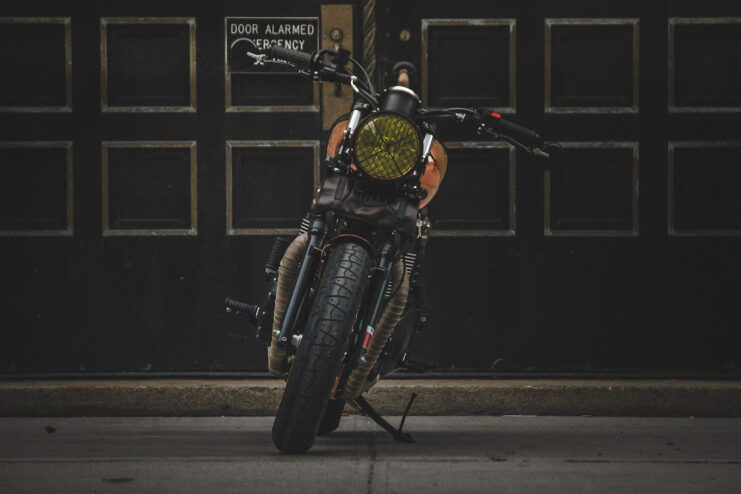 Dubbed “Miss Moneypenny,” the fuel tank, headlight, bucket, inner ring, skid plate and fenders were all removed and in turn coated with a slick, shiny copper finish. Reverse cone mufflers then complete the wrapped exhaust headers, while a set of shorty turn signals, headlight bracket and a reg/rec relocation kit were also added. The Triumph Bonneville Miss Moneypenny was also outfitted with adjustable springs up front and piggyback shocks in the rear, as the wide wheel kit comes courtesy of Canyon Racing, and Pirelli Phantom tires were chosen to complete the custom motorcycle.