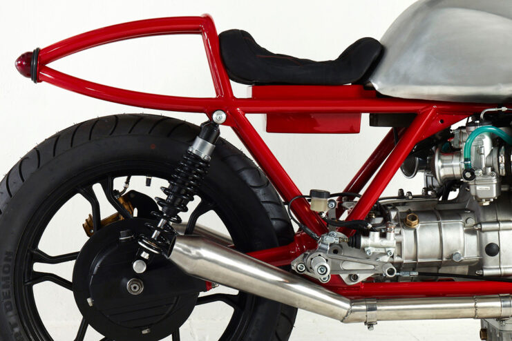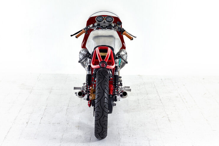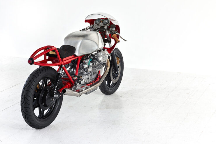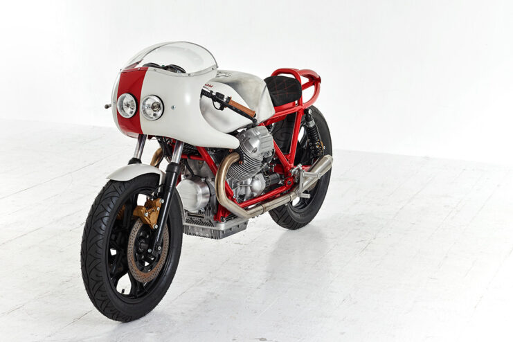 The custom bike is rounded out with a precision paintwork in Italian Red gloss and a satin finish Old English white, with a hand painted Moto Guzzi logo. To learn more about this pretty one, be sure to pay the Death Machines of London website a visit.
