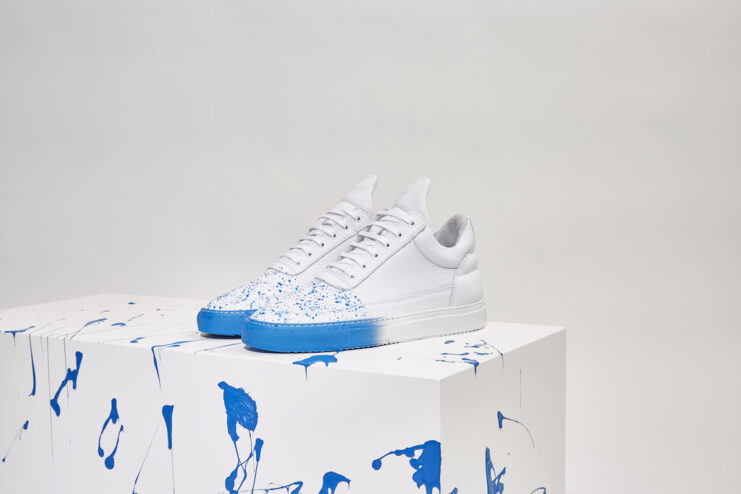 The Low Top style is delivered in blue/white and grey/white colorways, featuring a gradient ripple sole and paint splatters on the toe box, all handcrafted in Portugal.