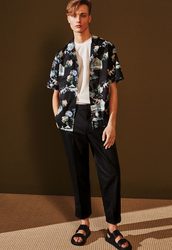 H&M unveils its latest menswear lookbook for its Spring/Summer 2016 collection. Featuring an East-meets-West aesthetic, the range perfectly blends Japanese minimalism with retro Americana, through boxy cuts, kimonos and mostly monochromatic color palette, with silky fabrics and bold graphics.