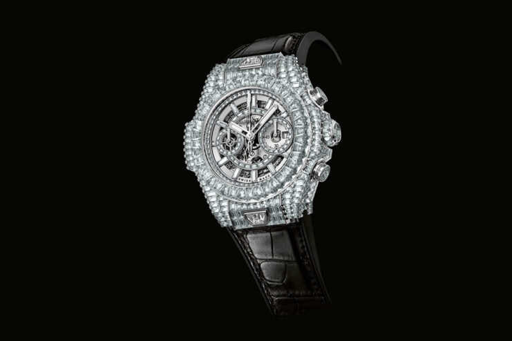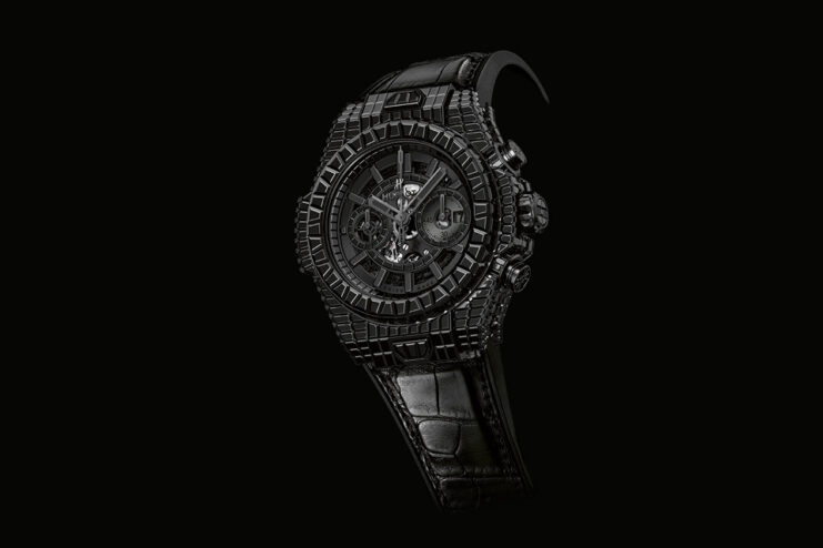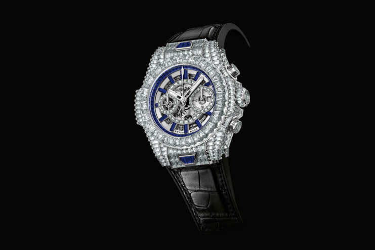 Luxury watch label Hublot celebrates the 10th anniversary of its iconic Big Bang watch, and it has unveiled a four diamond-adorned “Haute Joaillerie” iterations costing $1 million (approximately 3.7 million AED) each. The piece features a luxurious swathe of 653 baguette diamonds totaling over 40 carats, which have been set using invisible, rail and a Clou de Paris setting. It is available in black and white stones, with further blue and red versions which features baguette sapphires and rubies. The Hublot Big Bang 10th Anniversary Edition is limited to just 10 pieces.