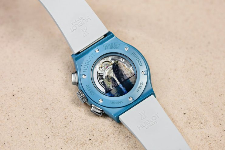 The most notable design element is featured on the caseback, depicting the Faraglioni, the iconic coastal and oceanic rock formation eroded by waves. Other notable details include a Caliber Hublot HUB1155 self-winding chronograph movement that provides 42 hours of power reserve, titanium hardware, and a stainless steel deployant buckle clasp.