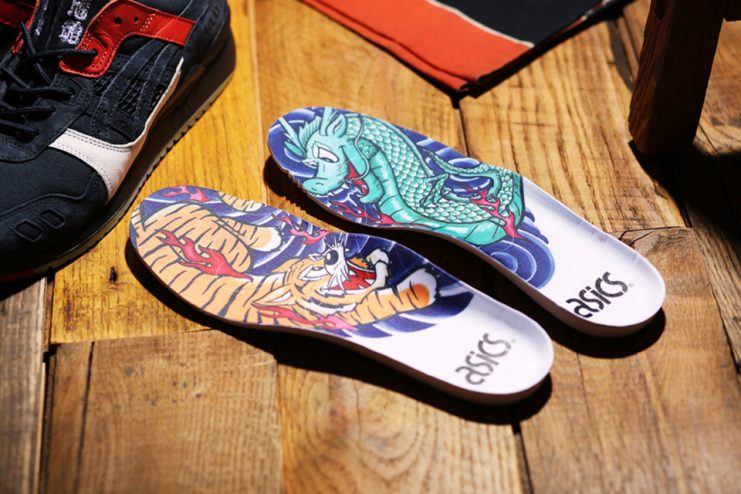 Decked-out in a navy, red and white color combination, the sneaker features Japanese embroidery on the split tongue, roped laces, along with a “tiger versus dragon” art motif on the insoles. An orange and translucent navy outsole rounds out the design.