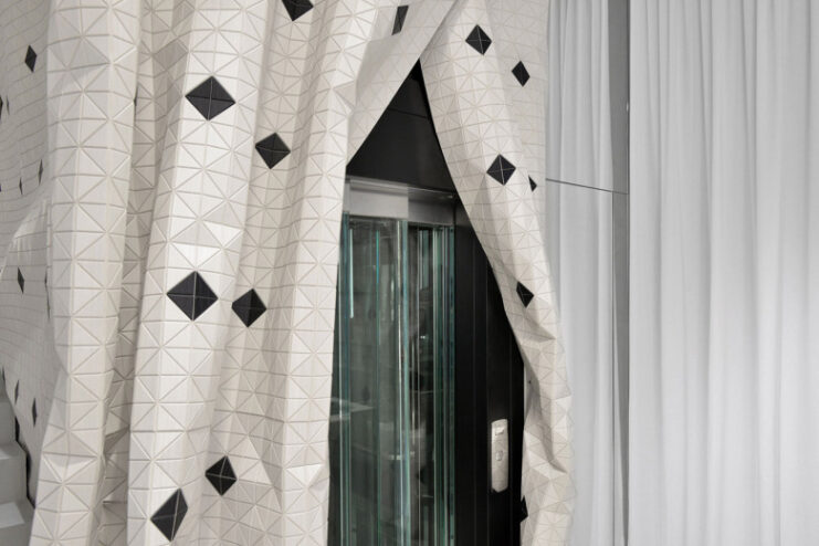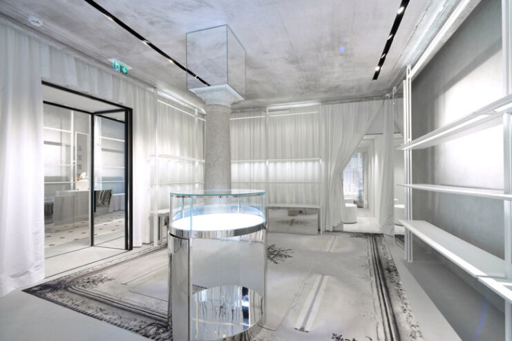 Maison Margiela has opened a new flagship store in Milan, in collaboration with Wood-Skin. With more than 300 sq. m. of space, the ground floor houses womenswear and accessories while the first floor situates the house’s “Artisinal” haute couture line as well as shoes. Located within Milan’s historical center, the two-story space which sports a clean, whitewashed aesthetic, blends key elements of modernistic design with classical architectural components. The floors bear a mixture of concrete and tiled techniques, while much of the walls are mirrored, and curtains have been placed strategically.