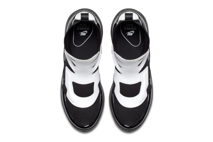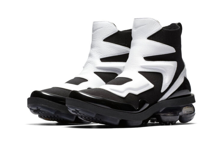 The shoe features a high-top boot motif with a sock-like upper. The knitted upper features accents in the form of leather overlays that combine boot influences with a futuristic look. The “Black/White” colorway offers a bold, high-contrast look while the “Triple Black” variation offers a more relaxed look. Both models feature a black knitted upper, a sturdy midsole reinforced with molded mudguards, and a semi-transparent black VaporMax heel.