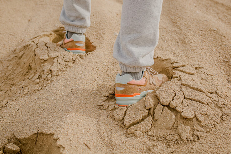 The Packer x New Balance 999 “CML” sneaker is decked-out in nappy suede “for a look derived from the desert sands, but geared towards city streets.” Joining the suede is a micro-perforated pigskin toebox, and premium nubuck details at the tongue and heel tab. Additional touches include a supple brown leather trim, a reflective silver 3M hit on the heel, a graphic-branded insert, and speckled laces.