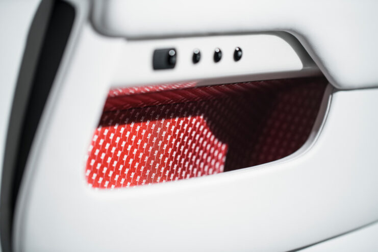 A range of fine silks and unexpected textures have been incorporated into the car’s interior of truly bold and distinctive Bespoke commissions. “Dawn’s” exterior color scheme comes in neutral Andalucian White, accented by one of the three vivid colours: Mugello Red, Cobalto Blue or Mandarin – which adorn the folding soft-top roof as well as the embroidered headrests and piping of the seats.