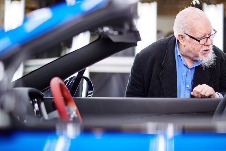 The use of collage shows a vibrant and clear-cut color throughout the exterior of the car. “St Luke’s Blue”, a bespoke color introduced by Sir Peter, dominates the car’s iconic rear, doors and boot lid, with a British Racing Green lower body, and a Fuchsia pink-colored radiator shell. The most prominent feature in this design is probably the “St James Red” heart motif hand painted onto a “Continental Yellow” bonnet, a symbol in-keeping with the compassionate work of hospices.