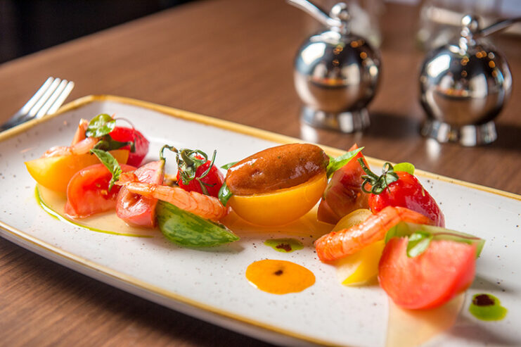 Variation of tomatoes with the Crudo red Sicillian prawns and tomatoes sorbet