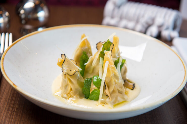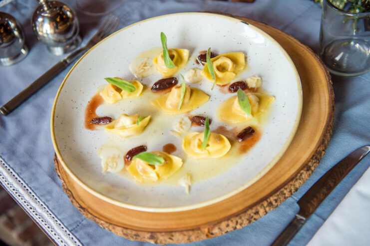 Traditional homemade squash tortelli with amaretti, grape sauce and almonds curd