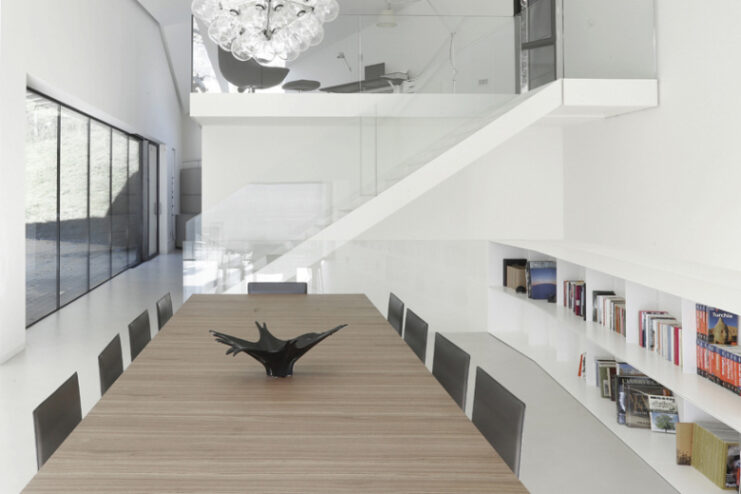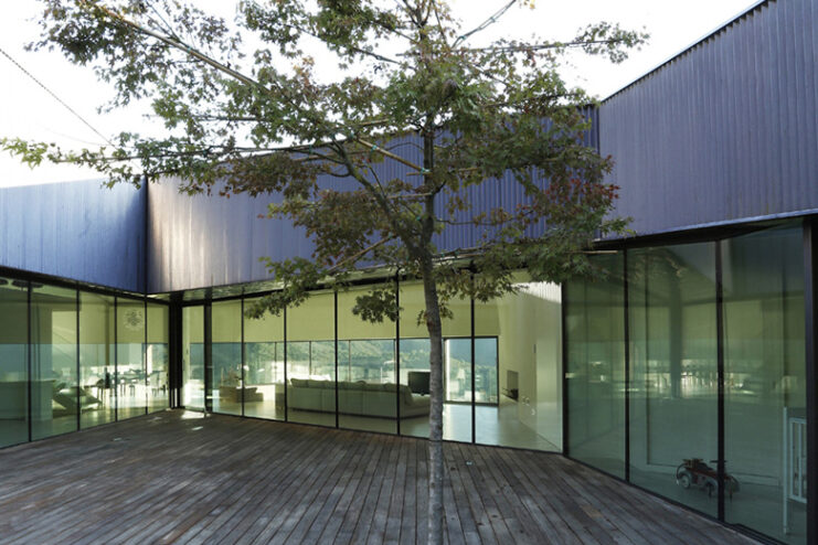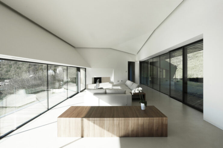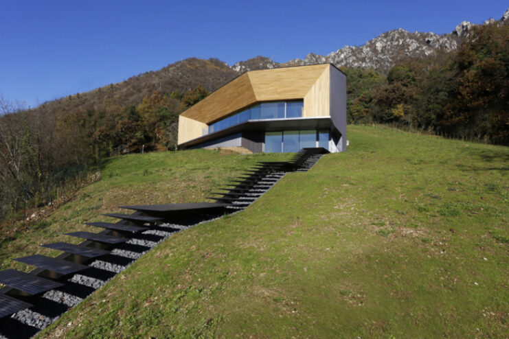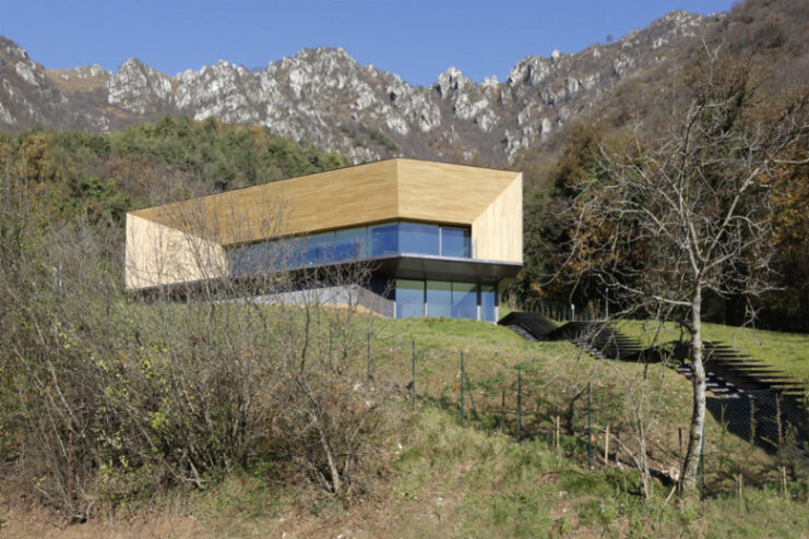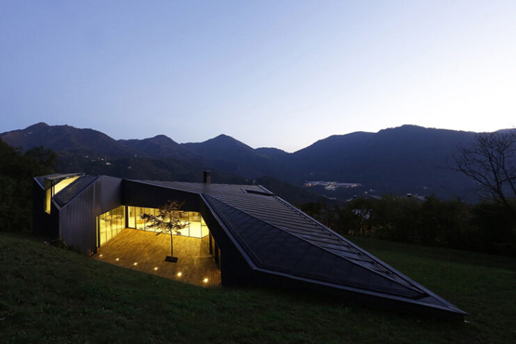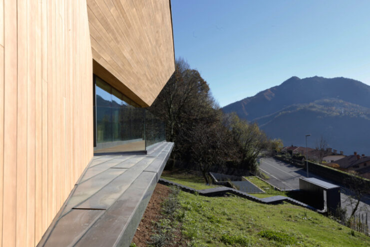 Built in between trompia valley and sabbia valley in Northern Italy, Camillo Botticini Architect’s latest project – the ‘Alps Villa’ has been designed to capture different sides of the mountainous landscape. The exterior of the home has been made with a combination of oxidized copper and accoya wood, while at the interior, the home is kept minimal, with resin floors lining and a running glass motif to preserve the clean, streamlined aesthetic. Constructed in a C-shape, to conceal the three stories embedded to the landscape, the residence is accessed through a driveway with a covered ramp leading vehicles to an underground parking, and at the same time pedestrian access is constituted by a linear staircase made of steel leading from the road to the entrance. Glance through the photo gallery above, and proceed to Camillo Botticini Architect’s website to see their other works.
