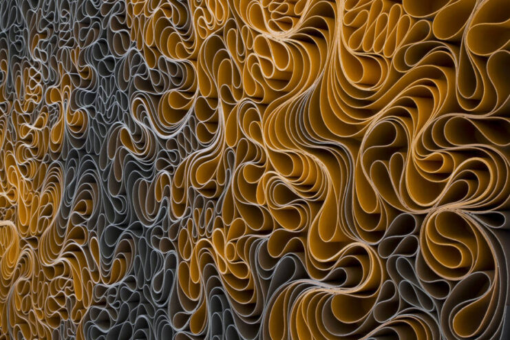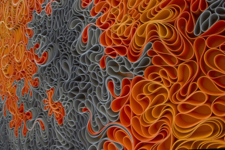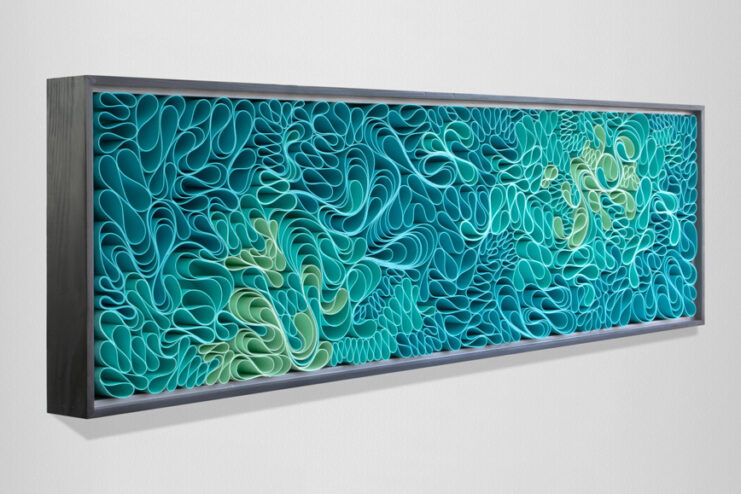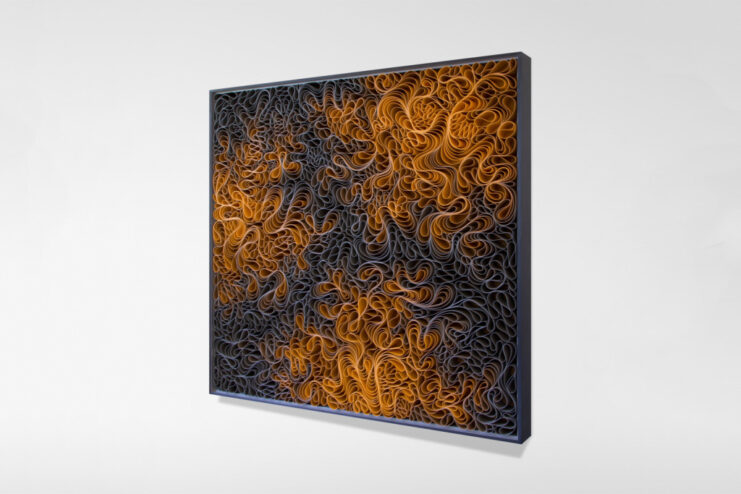 Stallman Studio, made up of Stephen Stum and Jason Hallman, showcases their creative works. They’ve made use of colored tissue papers in a wavy pattern, brilliantly arranged inside frames, and the end result is an arabesque look, that when viewed from afar gives an impression of relief maps with varying intensity. Head over to Stallman Studio’s website, where these beautiful works of art and more are available for sale.