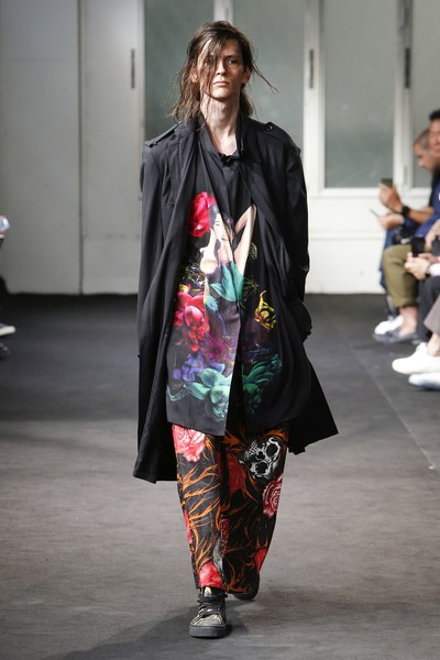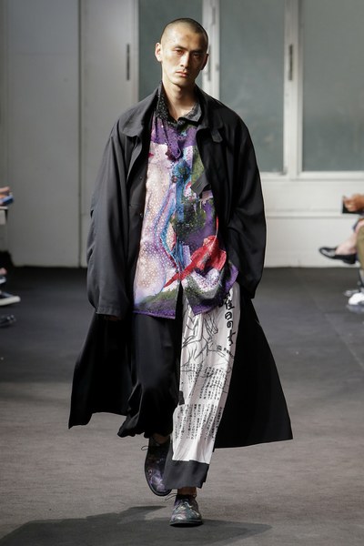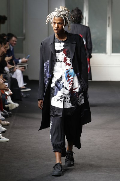 Yohji Yamamoto showcased his Spring/Summer 2019 collection at Paris Fashion Week. The legendary Japanese designer came through with his signature avant-garde and voluminous dark style. The collection distinguished itself with a variety of bold prints, which include floral imagery across shirts and pants, faces, and plenty of Japanese Kana.